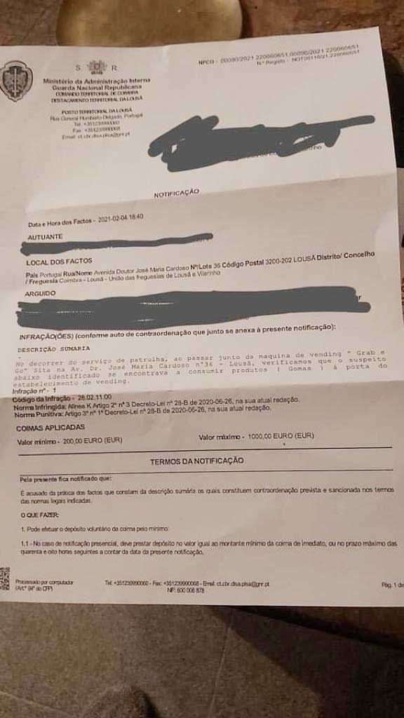 Um cidadão foi multado por alegadamente estar a comer gomas junto a uma máquina de vendas “Grab & Go”. O cidadão terá recebido uma notificação onde é relatado o sucedido, bem como o local da ocorrência, e com a indicação para efectuar o deposito no valor mínimo da coima, neste caso de 200€.